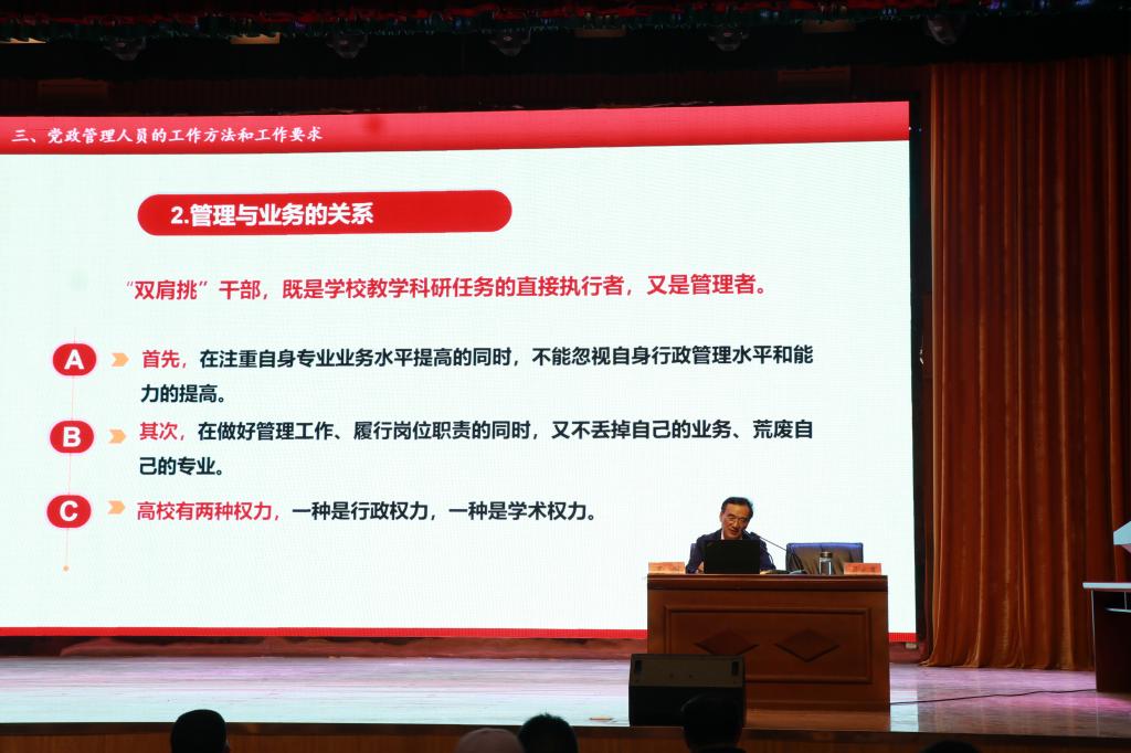 王剑从党政管理人员的职责和作用、素质和能力、工作方法和工作要求等三个方面,详细讲解了党政管理人员全面提升个人素质和作风能力的科学途径。王剑指出,高校党政管理人员是联系学校党政班子和广大师生的重要枢纽,是学校各职能部门和学院的管理者、服务者、组织者,肩负着落实各项部署、制定科学战略的重要任务。学校党政管理人员要具备管理职责范围内的各类事务、处理各种关系的能力,要坚持讲政治,坚持“高线”,守住“底线”。
