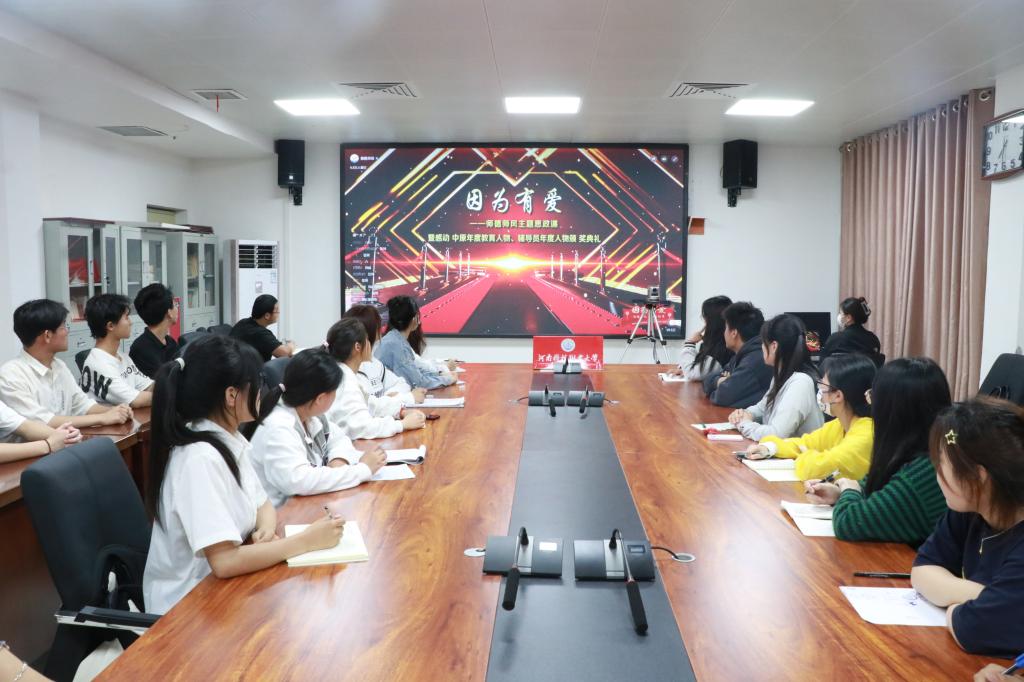 为贯彻落实习近平新时代中国特色社会主义思想和党的二十大精神,贯彻落实立德树人根本任务,学习宣传我省教育系统近两年涌现出的“四有”好老师典型人物的崇高风范和优秀精神品质,2023年5月25日晚,我校组织师生通过多种方式收看由省委教育工委、省教育厅主办,郑州工程技术学院、南阳师范学院、河南理工大学承办的“因为有爱”师德师风主题思政课暨感动中原年度教育人物、辅导员年度人物颁奖典礼。
