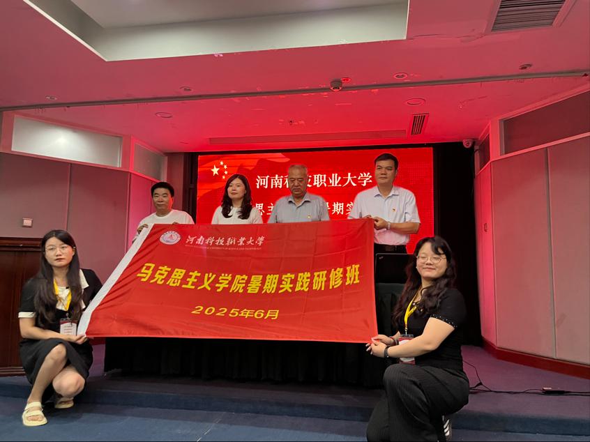 在开班仪式上,杨林防为我校马克思主义学院暑期实践研修班进行授旗。