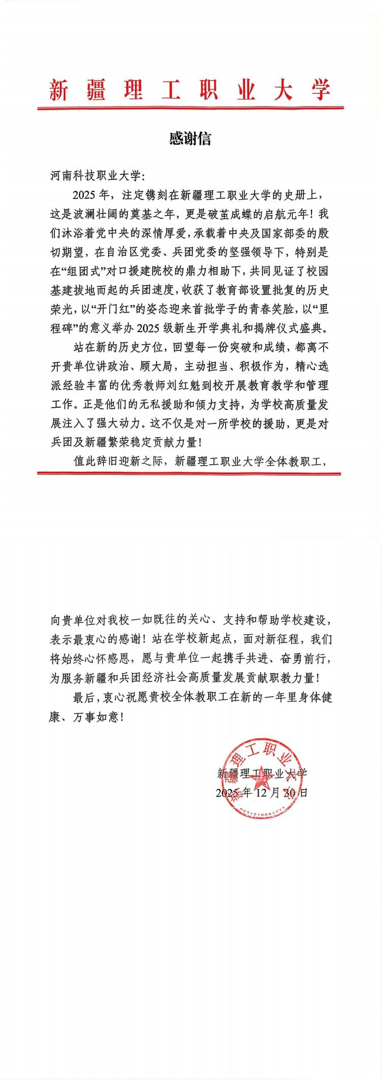 在新的一年来临之际,我校收到来自新疆理工职业大学的感谢信。信中,新疆理工职业大学对我校在其奠基启航的关键之年给予的对口援建支持致以诚挚谢意,高度肯定了我校选派优秀教师刘红魁赴疆开展教育教学与管理工作的突出成效,称赞我校的无私援助为该校高质量发展注入强大动力,为兵团及新疆繁荣稳定贡献了职教力量。