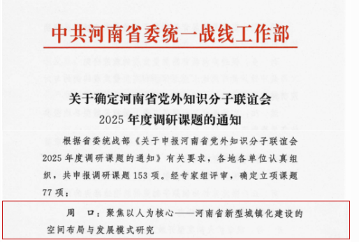 根据中共河南省委统一战线工作部下发《关于确定河南省党外知识分子联谊会2025年度调研课题的通知》,经专家组严格评审,我校教师赵光磊申报的《聚焦以人为核心—河南省新型城镇化建设的空间布局与发展模式研究》课题成功立项