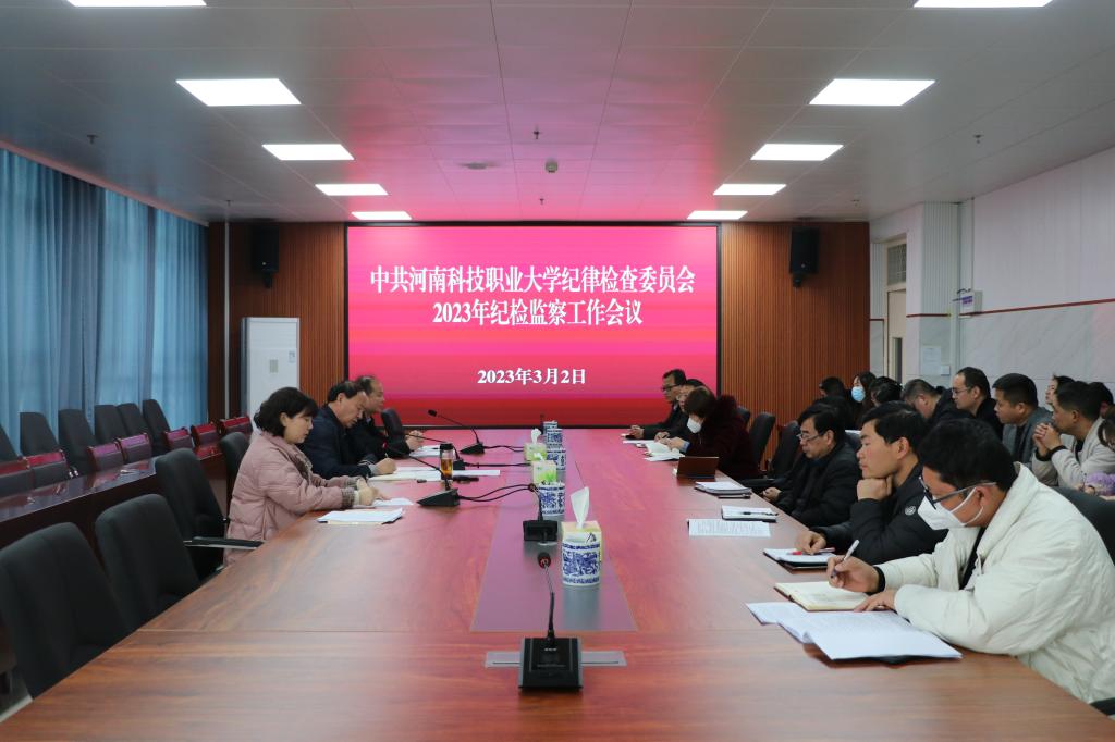 为深入贯彻落实第二十届中央纪委二次全会和十一届省纪委三次全会精神,切实加强我校党风廉政建设和反腐败工作,着力构建风清气正、和谐稳定的校园环境,2023年3月2日,在综合教学中心8楼会议室组织召开了中共河南科技职业大学纪律检查委员会2023年纪检监察工作会议。校纪委书记凌现庄,纪委副书记陈见辉出席会议。校纪委委员,各党总支、直属党支部书记、纪检委员参加会议。会议由纪委办公室主任马婷主持。