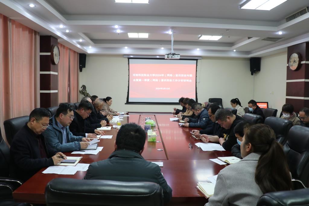 3月14日,我校在综合楼9楼会议室召开2024年(网络)意识形态工作专题会暨第一季度(网络)意识形态工作分析研判会。校党委书记苏宇,副书记司元亨、夏永亮出席会议,党委各职能部门负责人,各党总支(直属党支部)书记,各处室主要负责人参加会议。会议由夏永亮主持。