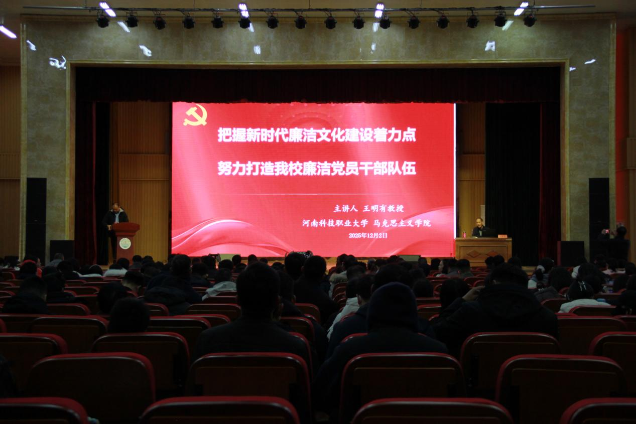 讲座中,王明有教授围绕“把握新时代廉洁文化建设着力点,努力打造我校廉洁党员干部队伍”这一主题,从四个方面展开深入讲解。他首先带领全体参会人员深刻领会新时代廉洁文化的丰富内涵,系统阐释了其核心要义与时代价值;并结合典型案例,就如何筑牢思想道德防线、提高拒腐防变能力进行了细致剖析,为党员干部敲响廉洁自律警钟;同时强调要以全面从严治党为遵循,严格依照党章党规党纪正身立行,坚守纪律规矩底线;最后针对高校工作实际,明确提出我校党员领导干部要争当校园廉洁文化建设的模范实践者,发挥示范引领作用。